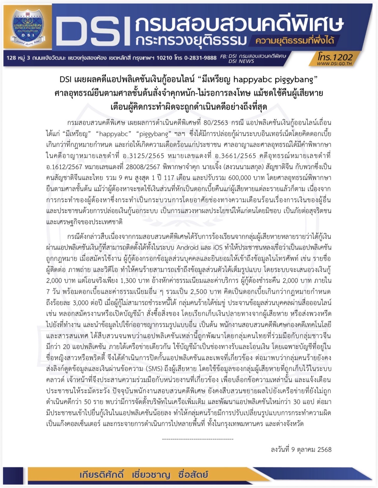 DSI เผยผลคดีแอปพลิเคชันเงินกู้ออนไลน์ “มีเหรียญ happyabc piggybang” ศาลอุทธรณ์ยืนตามศาลชั้นต้นสั่งจำคุกหนัก-ไม่รอการลงโทษ แม้ชดใช้คืนผู้เสียหายเตือนผู้คิดกระทำผิดจะถูกดำเนินคดีอย่างถึงที่สุด