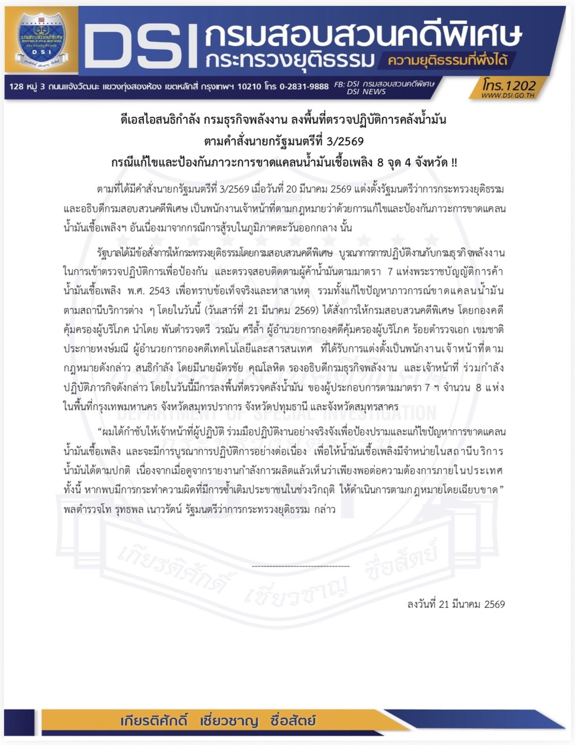 รัฐบาลได้มีข้อสั่งการให้กระทรวงยุติธรรมโดยกรมสอบสวนคดีพิเศษ บูรณาการการปฏิบัติงานกับกรมธุรกิจพลังงาน ในการเข้าตรวจปฏิบัติการเพื่อป้องกัน และตรวจสอบติดตามผู้ค้าน้ำมันตามมาตรา 7 แห่งพระราชบัญญัติการค้าน้ำมันเชื้อเพลิง พ.ศ. 2543 เพื่อทราบข้อเท็จจริงและหาสาเหตุ รวมทั้งแก้ไขปัญหาภาวการณ์ขาดแคลนน้ำมัน ตามสถานีบริการต่าง ๆ โดยในวันนี้ (วันเสาร์ที่ 21 มีนาคม 2569) ได้สั่งการให้กรมสอบสวนคดีพิเศษ โดยกองคดีคุ้มครองผู้บริโภค นำโดย พันตำรวจตรี วรณัน ศรีล้ำ ผู้อำนวยการกองคดีคุ้มครองผู้บริโภค ร้อยตำรวจเอก เขมชาติ ประกายหงษ์มณี ผู้อำนวยการกองคดีเทคโนโลยีและสารสนเทศ ที่ได้รับการแต่งตั้งเป็นพนักงานเจ้าหน้าที่ตามกฎหมายดังกล่าว สนธิกำลัง โดยมีนายฉัตรชัย คุณโลหิต รองอธิบดีกรมธุรกิจพลังงาน และเจ้าหน้าที่ ร่วมกำลังปฏิบัติภารกิจดังกล่าว โดยในวันนี้มีการลงพื้นที่ตรวจคลังน้ำมัน ของผู้ประกอบการตามมาตรา 7 ฯ จำนวน 8 แห่ง ในพื้นที่กรุงเทพมหานคร จังหวัดสมุทรปราการ จังหวัดปทุมธานี และจังหวัดสมุทรสาคร