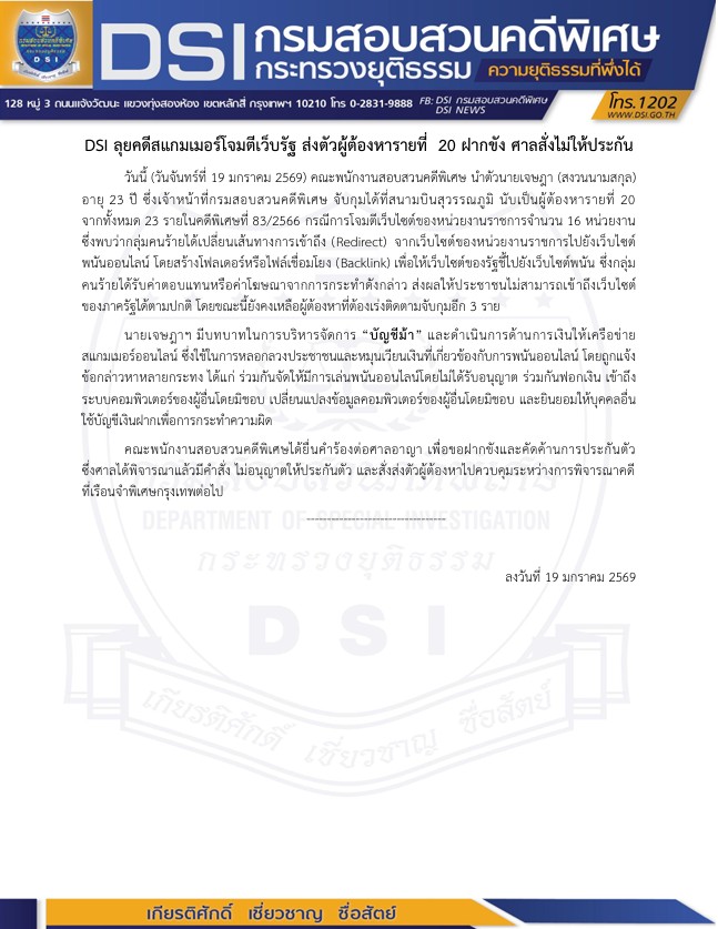 วันนี้ (วันจันทร์ที่ 19 มกราคม 2569) คณะพนักงานสอบสวนคดีพิเศษ นำตัวนายเจษฎา (สงวนนามสกุล) อายุ 23 ปี ซึ่งเจ้าหน้าที่กรมสอบสวนคดีพิเศษ จับกุมได้ที่สนามบินสุวรรณภูมิ นับเป็นผู้ต้องหารายที่ 20 จากทั้งหมด 23 รายในคดีพิเศษที่ 83/2566 กรณีการโจมตีเว็บไซต์ของหน่วยงานราชการจำนวน 16 หน่วยงาน ซึ่งพบว่ากลุ่มคนร้ายได้เปลี่ยนเส้นทางการเข้าถึง (Redirect) จากเว็บไซต์ของหน่วยงานราชการไปยังเว็บไซต์ พนันออนไลน์ โดยสร้างโฟลเดอร์หรือไฟล์เชื่อมโยง (Backlink) เพื่อให้เว็บไซต์ของรัฐชี้ไปยังเว็บไซต์พนัน ซึ่งกลุ่มคนร้ายได้รับค่าตอบแทนหรือค่าโฆษณาจากการกระทำดังกล่าว ส่งผลให้ประชาชนไม่สามารถเข้าถึงเว็บไซต์ของภาครัฐได้ตามปกติ โดยขณะนี้ยังคงเหลือผู้ต้องหาที่ต้องเร่งติดตามจับกุมอีก 3 ราย